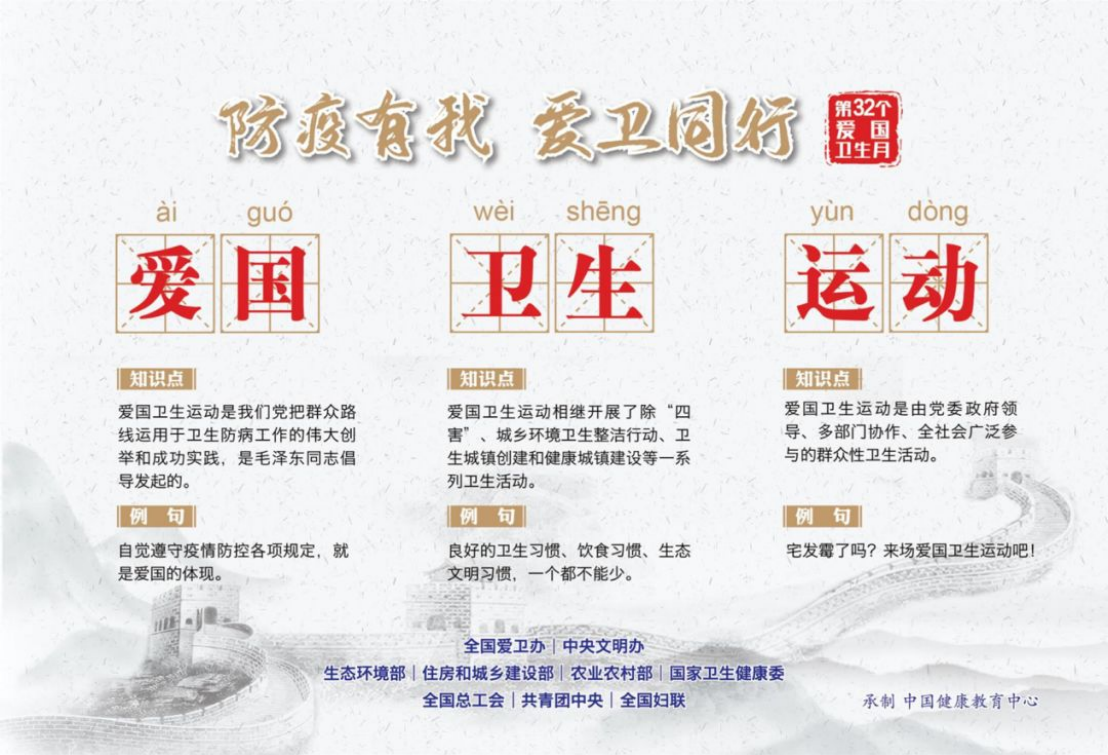 愛國是核心、衛(wèi)生是根本、運(yùn)動是方式,愛國衛(wèi)生人人受益,疫情防控人人有責(zé)。在以習(xí)近平同志為核心的黨中央堅強(qiáng)領(lǐng)導(dǎo)下,全國人民同舟共濟(jì)、眾志成城,新冠肺炎疫情防控取得顯著成效。道阻且長,行則將至。4月是第32個愛國衛(wèi)生月。為深入貫徹落實習(xí)近平總書記系列重要講話精神,大力開展愛國衛(wèi)生運(yùn)動,強(qiáng)化預(yù)防優(yōu)先,打造健康環(huán)境,為全面打贏新冠肺炎疫情狙擊戰(zhàn)奠定堅實基礎(chǔ),為鞏固疫情防控成果繼續(xù)貢獻(xiàn)自己的力量。