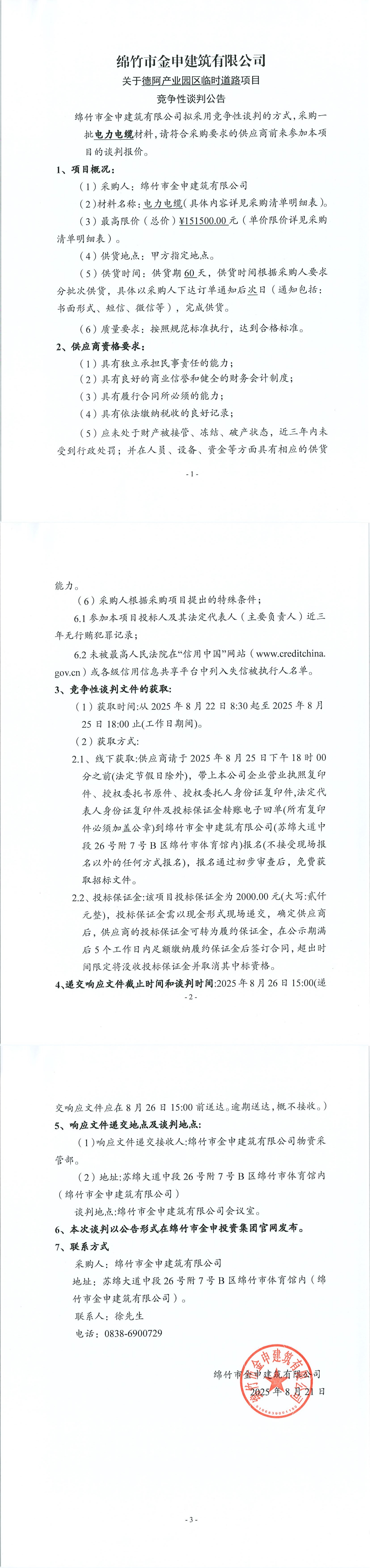 德阿產(chǎn)業(yè)園臨時道路(電力電纜)第二次競爭性談判公告