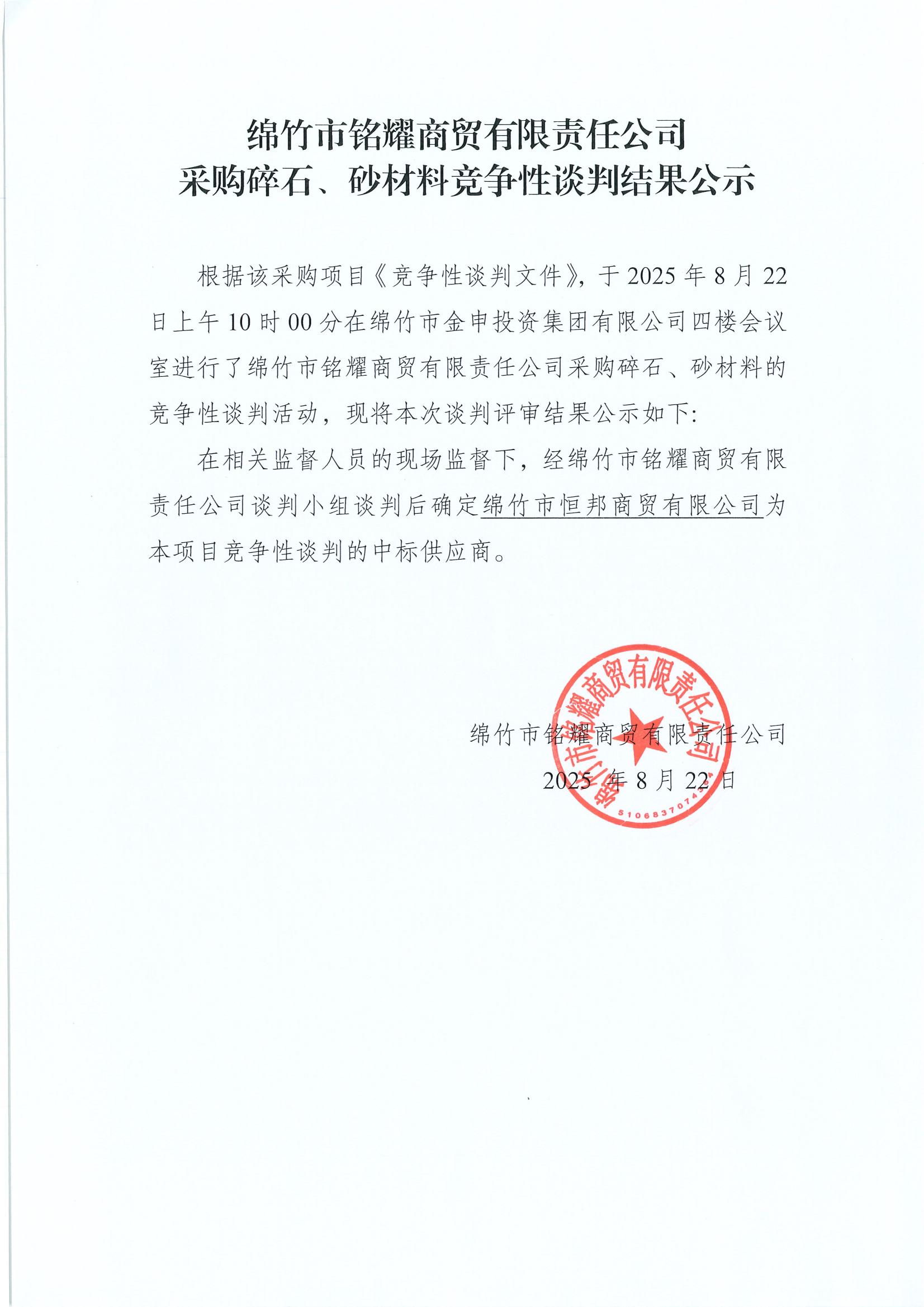 銘耀商貿(mào)采購(gòu)碎石、砂材料競(jìng)爭(zhēng)性談判結(jié)果公示