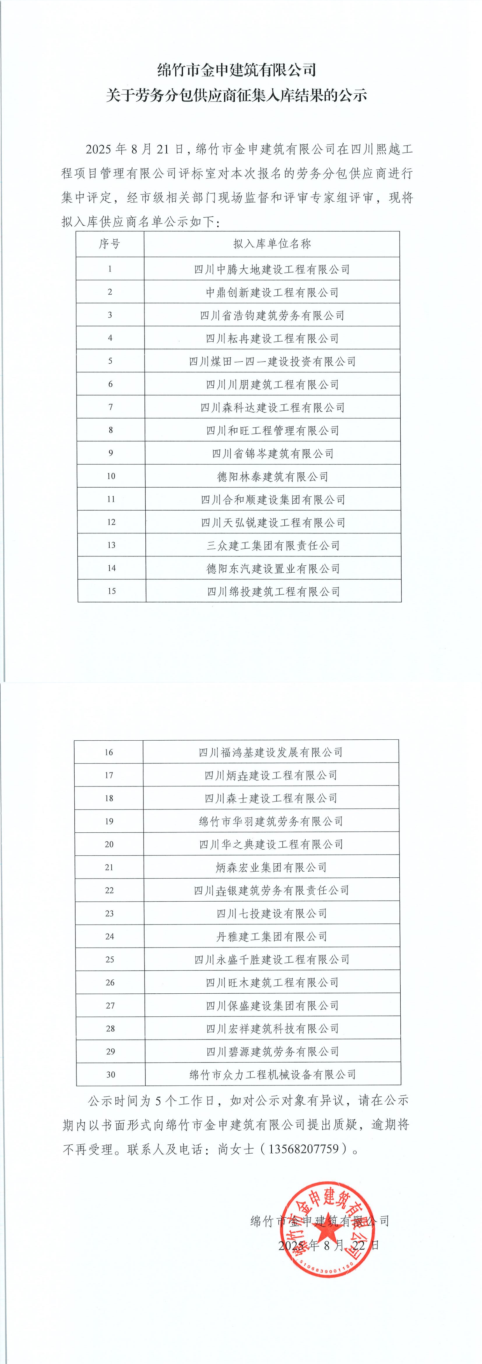 綿竹市金申建筑有限公司勞務(wù)分包供應(yīng)商征集入庫(kù)結(jié)果公示