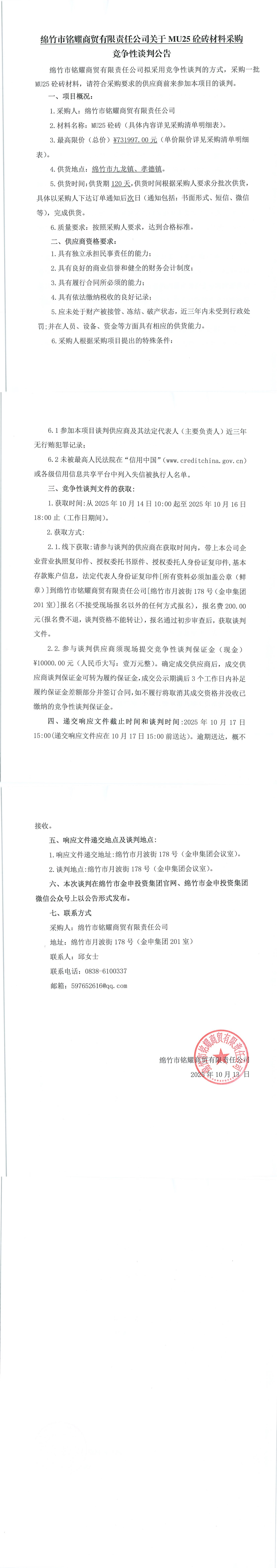 銘耀商貿(mào)MU25磚材料采購(gòu)競(jìng)爭(zhēng)性談判公告