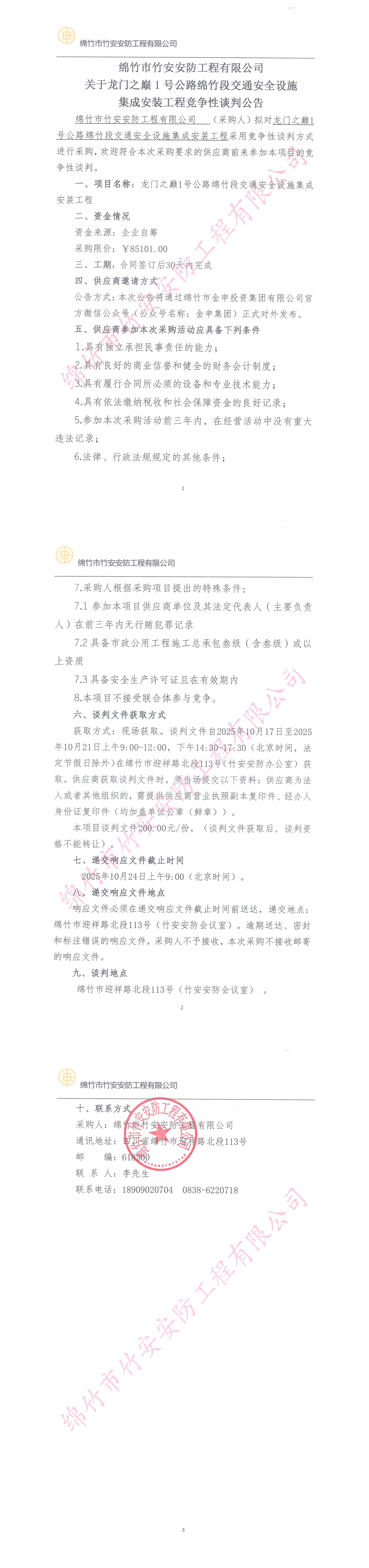 竹安安防關(guān)于龍門之巔1號(hào)公路綿竹段交通安全設(shè)施集成安裝工程競(jìng)爭(zhēng)性談判公告