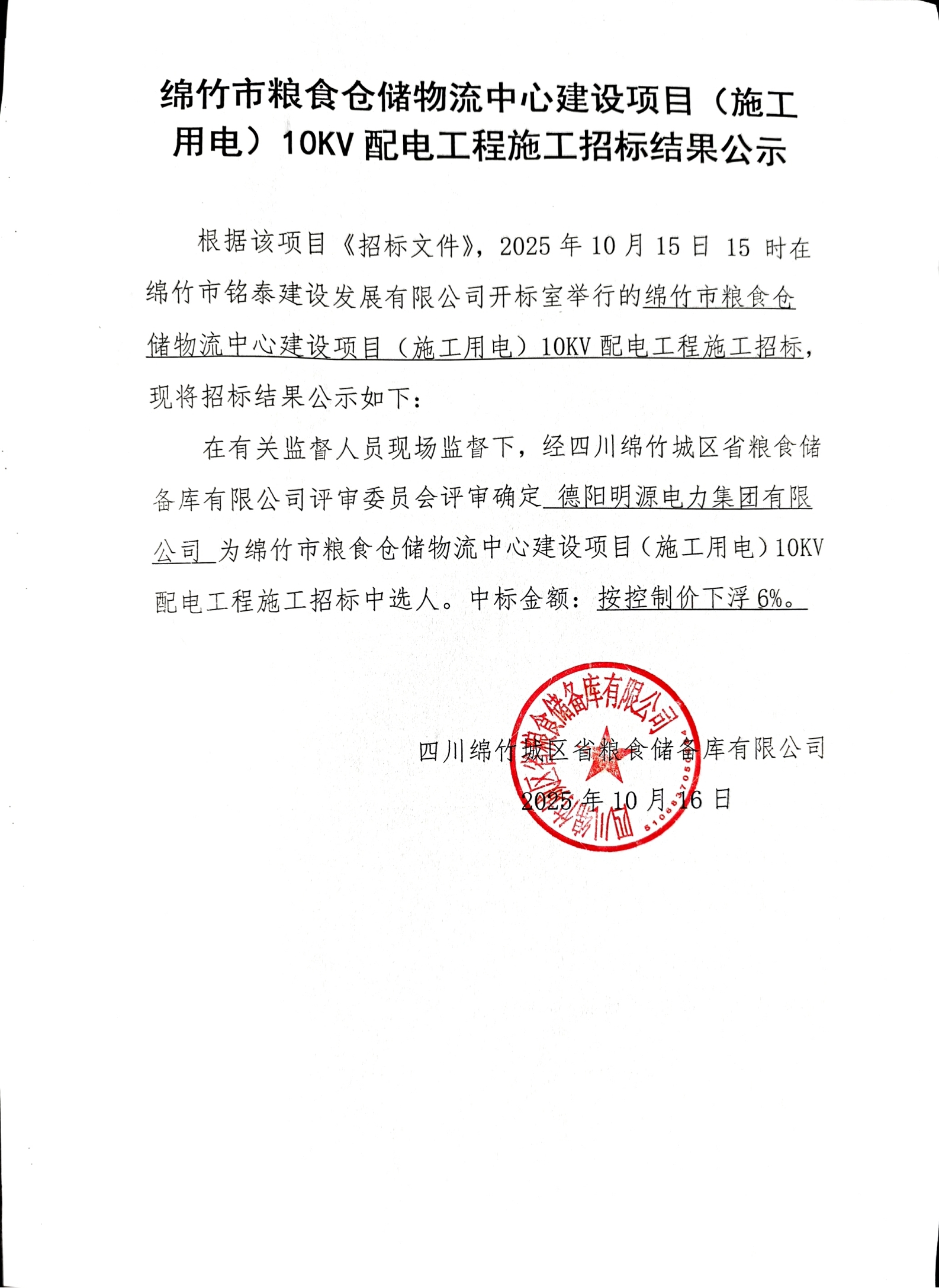 綿竹市糧食倉(cāng)儲(chǔ)物流中心建設(shè)項(xiàng)目(施工用電)10KV配電工程施工招標(biāo)結(jié)果公示