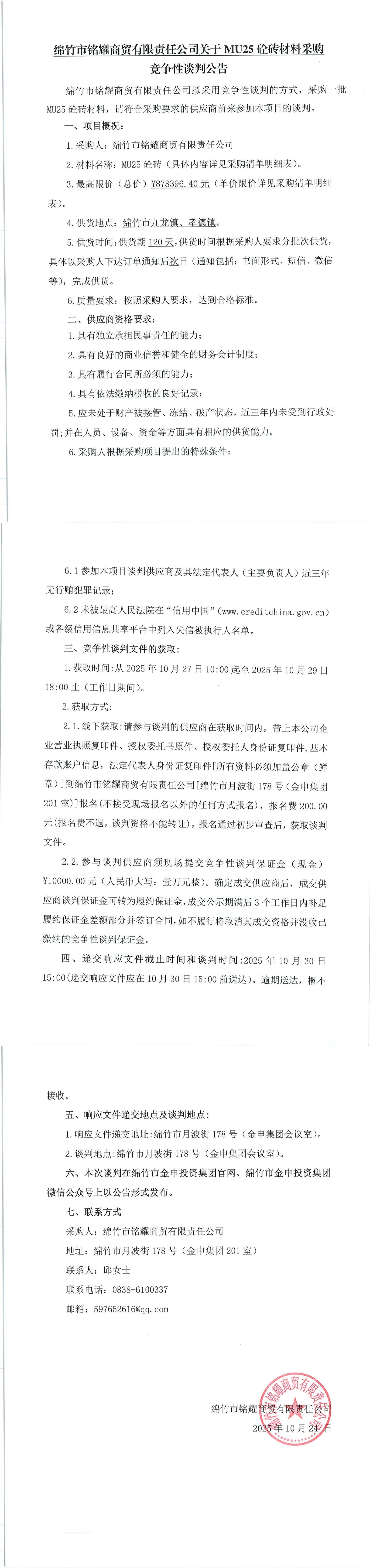 銘耀公司MU25砼磚競爭性談判公告