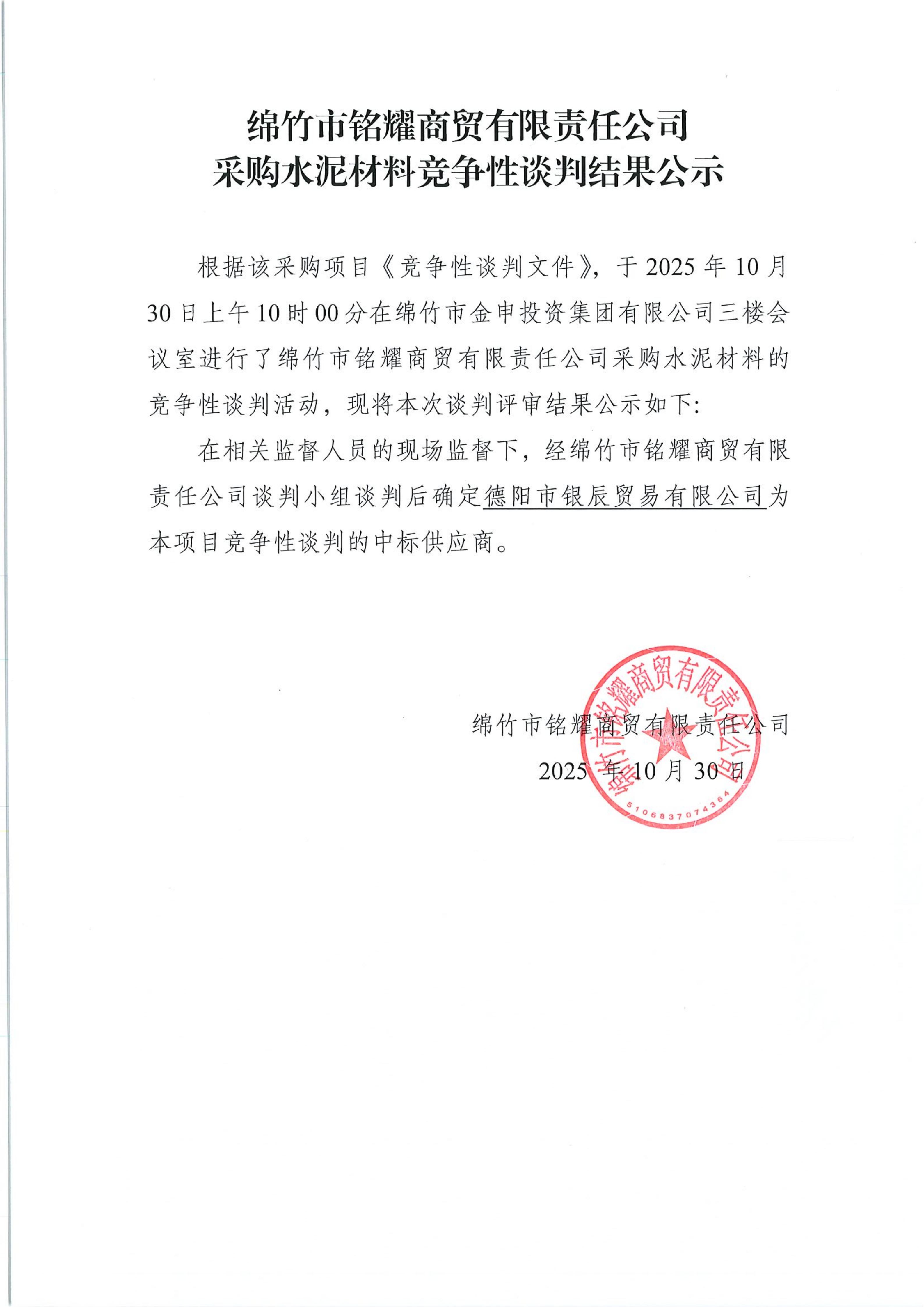 銘耀商貿(mào)采購(gòu)水泥競(jìng)爭(zhēng)性談判結(jié)果公示
