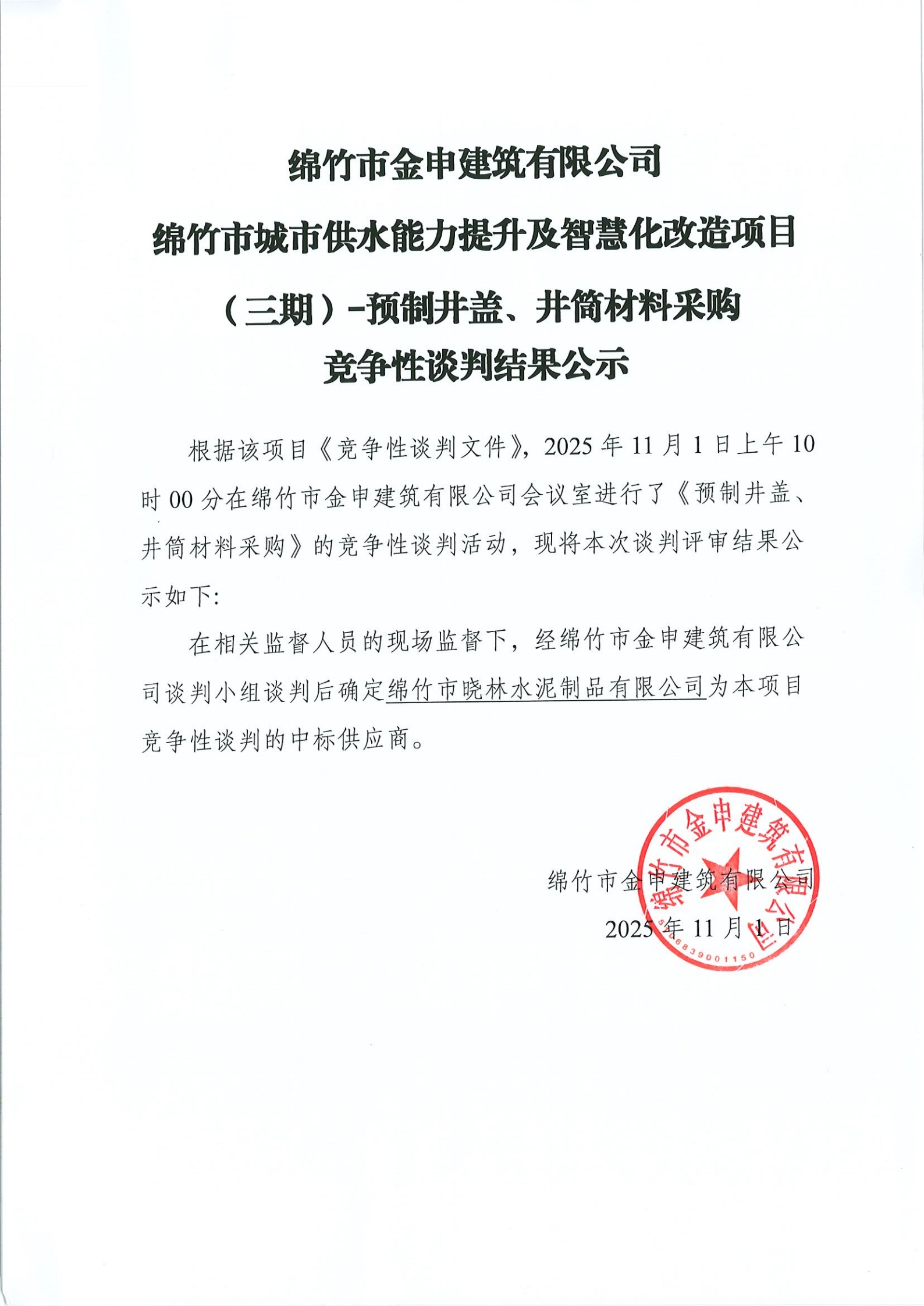 關(guān)于綿竹市城市供水三期預(yù)制井蓋井筒材料采購競爭性談判結(jié)果公示