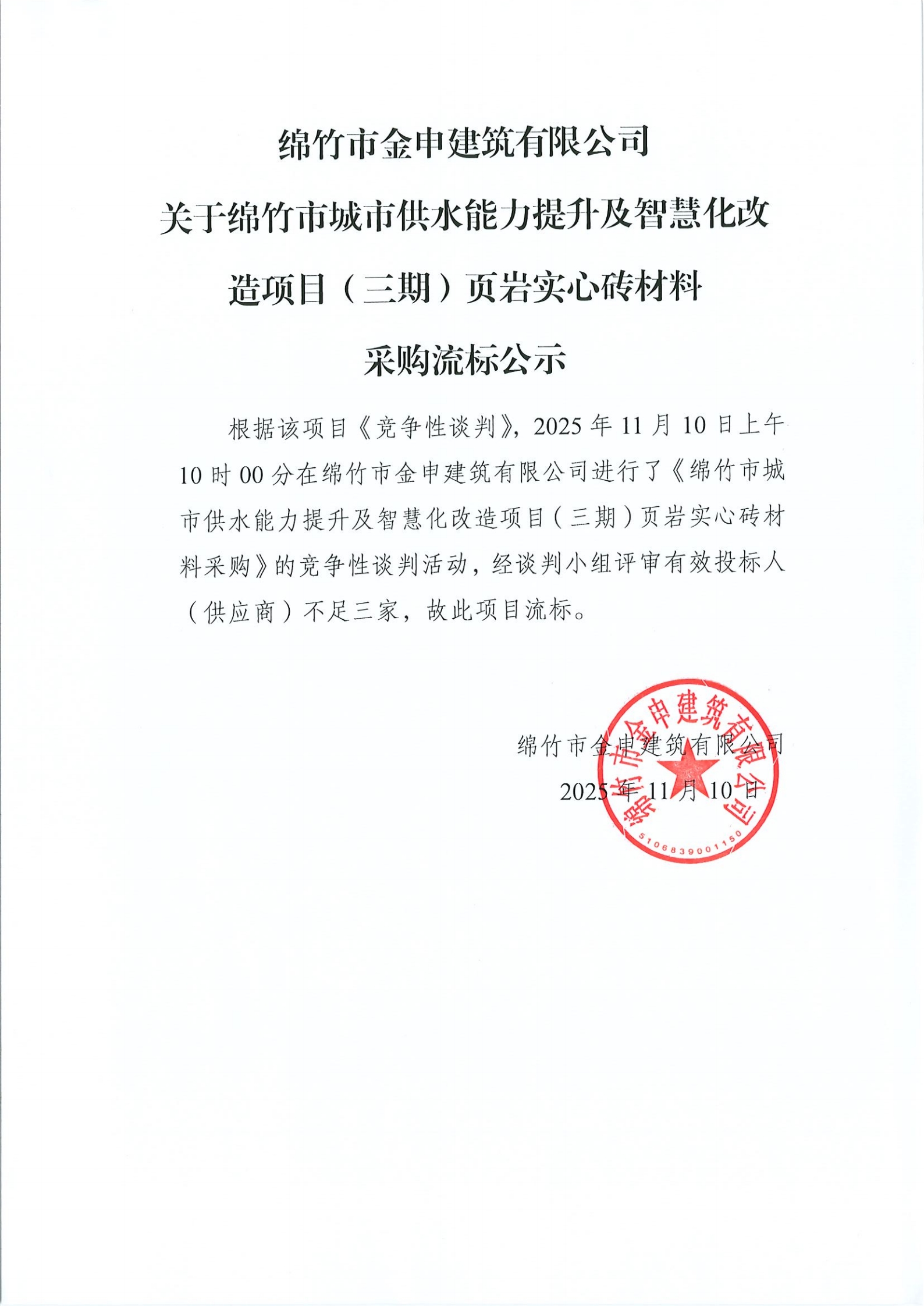 關(guān)于綿竹市城市供水三期(頁巖實(shí)心磚)材料采購流標(biāo)公示