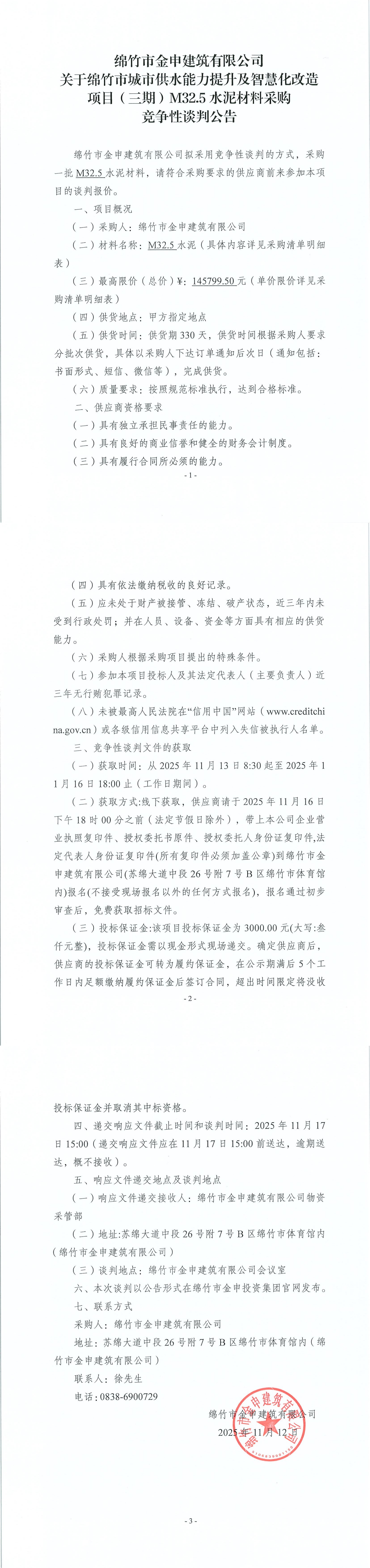 關(guān)于綿竹市城市供水三期(M32.5)水泥材料采購競爭性談判公告