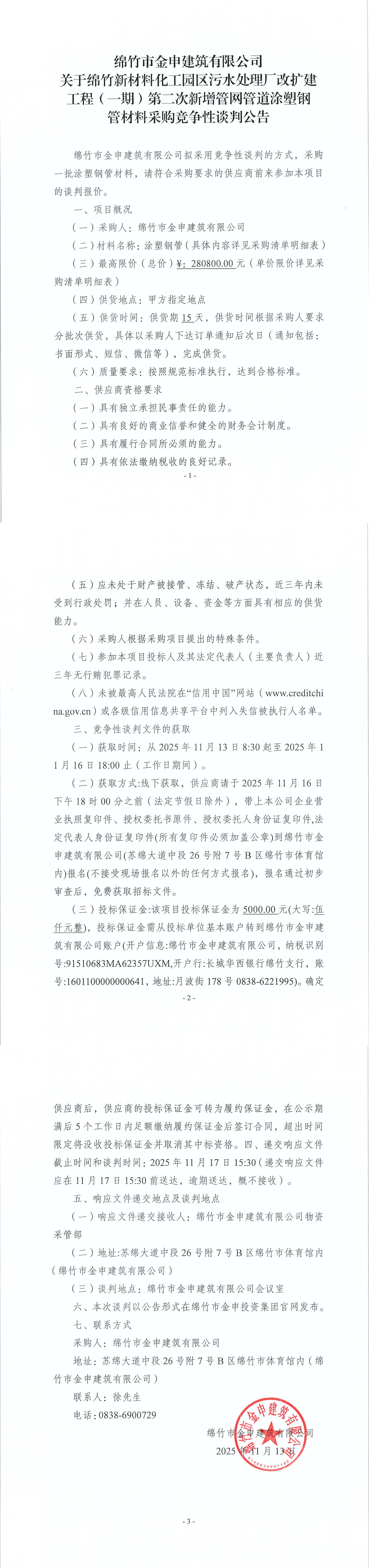 關(guān)于綿竹市新材料化工園一期(涂塑鋼管)材料采購(gòu)競(jìng)爭(zhēng)性談判公告