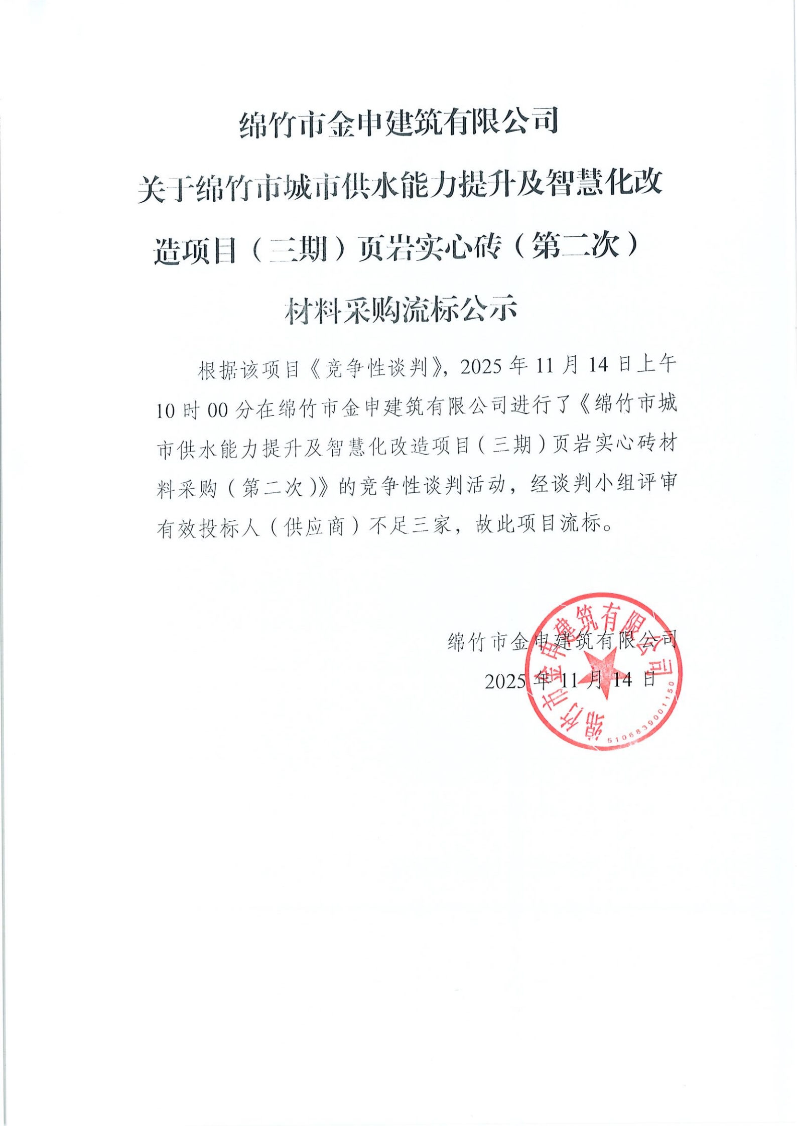 關(guān)于城市供水三期(頁(yè)巖實(shí)心磚)第二次材料采購(gòu)流標(biāo)公示