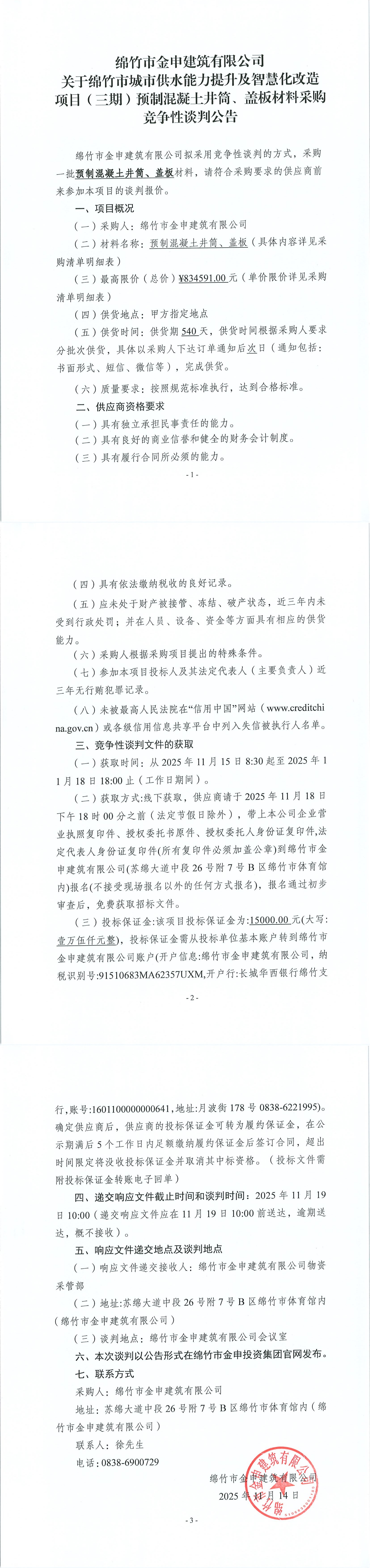 關(guān)于城市供水三期(預(yù)制混凝土井筒、蓋板)材料采購(gòu)競(jìng)爭(zhēng)性談判公告