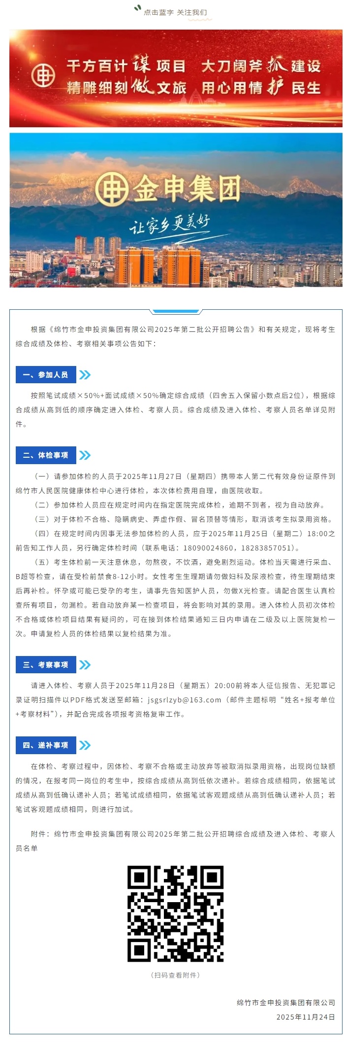 綿竹市金申投資集團有限公司2025年第二批公開招聘綜合成績及進入體檢、考察人員名單公告