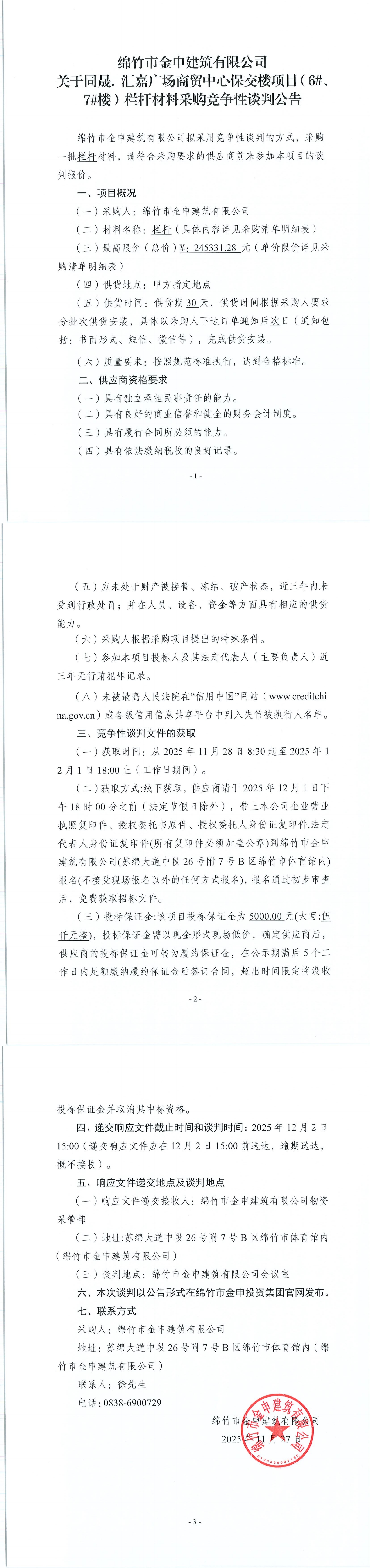 關(guān)于同晟.匯嘉廣場(chǎng)商貿(mào)中心保交樓項(xiàng)目(6#、7#樓)欄桿材料采購(gòu)競(jìng)爭(zhēng)性談判公告