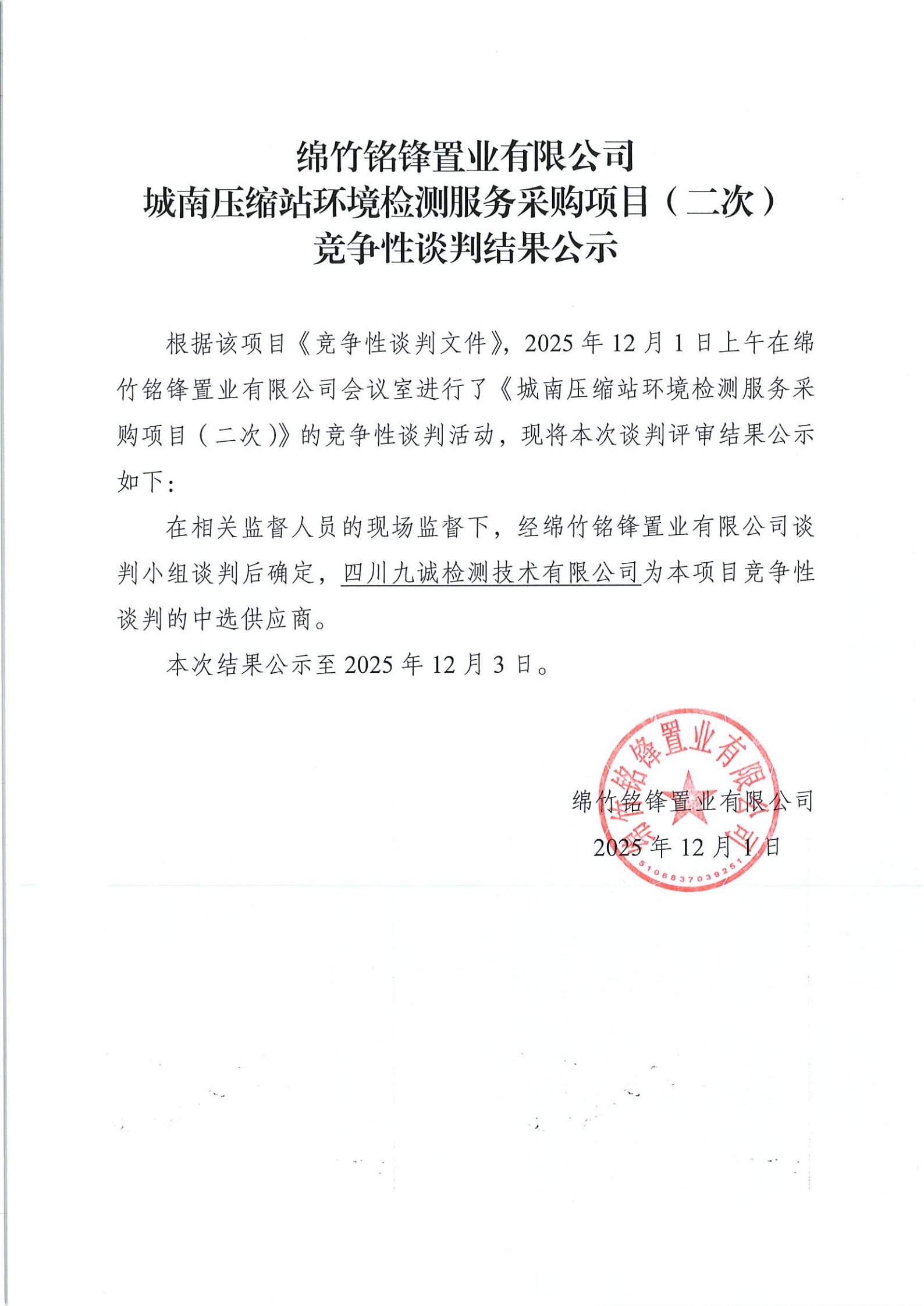 城南壓縮站環(huán)境檢測服務(wù)采購項目(二次)競爭性談判結(jié)果公示
