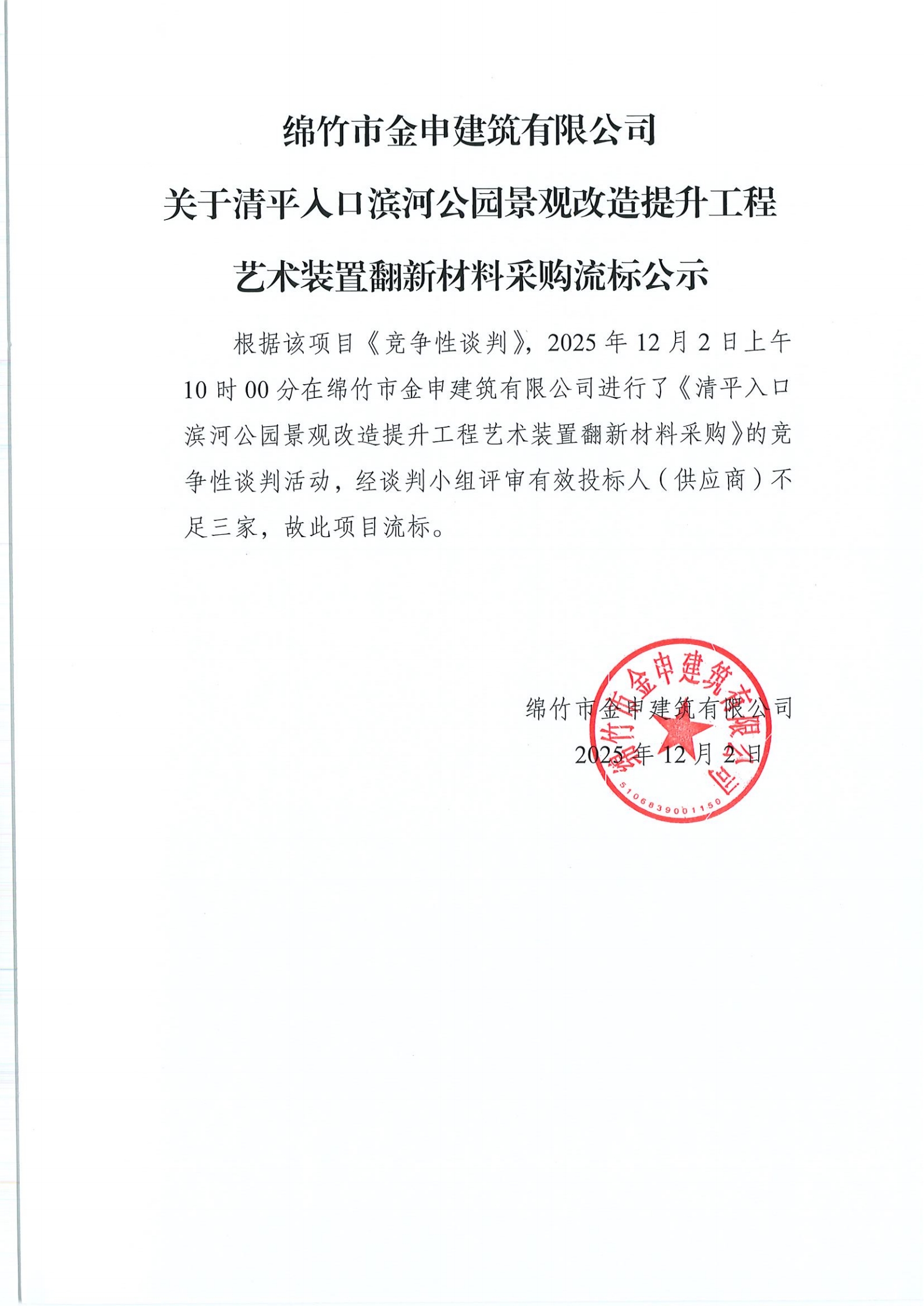 關(guān)于清平入口濱河公園藝術(shù)裝置翻新采購流標(biāo)公告