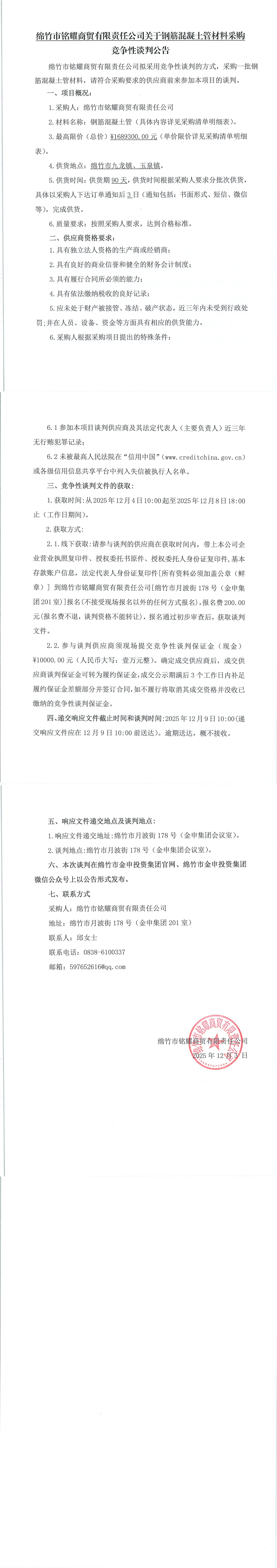 綿竹市銘耀商貿(mào)有限責(zé)任公司關(guān)于鋼筋混凝土管材料采購(gòu)競(jìng)爭(zhēng)性談判公告