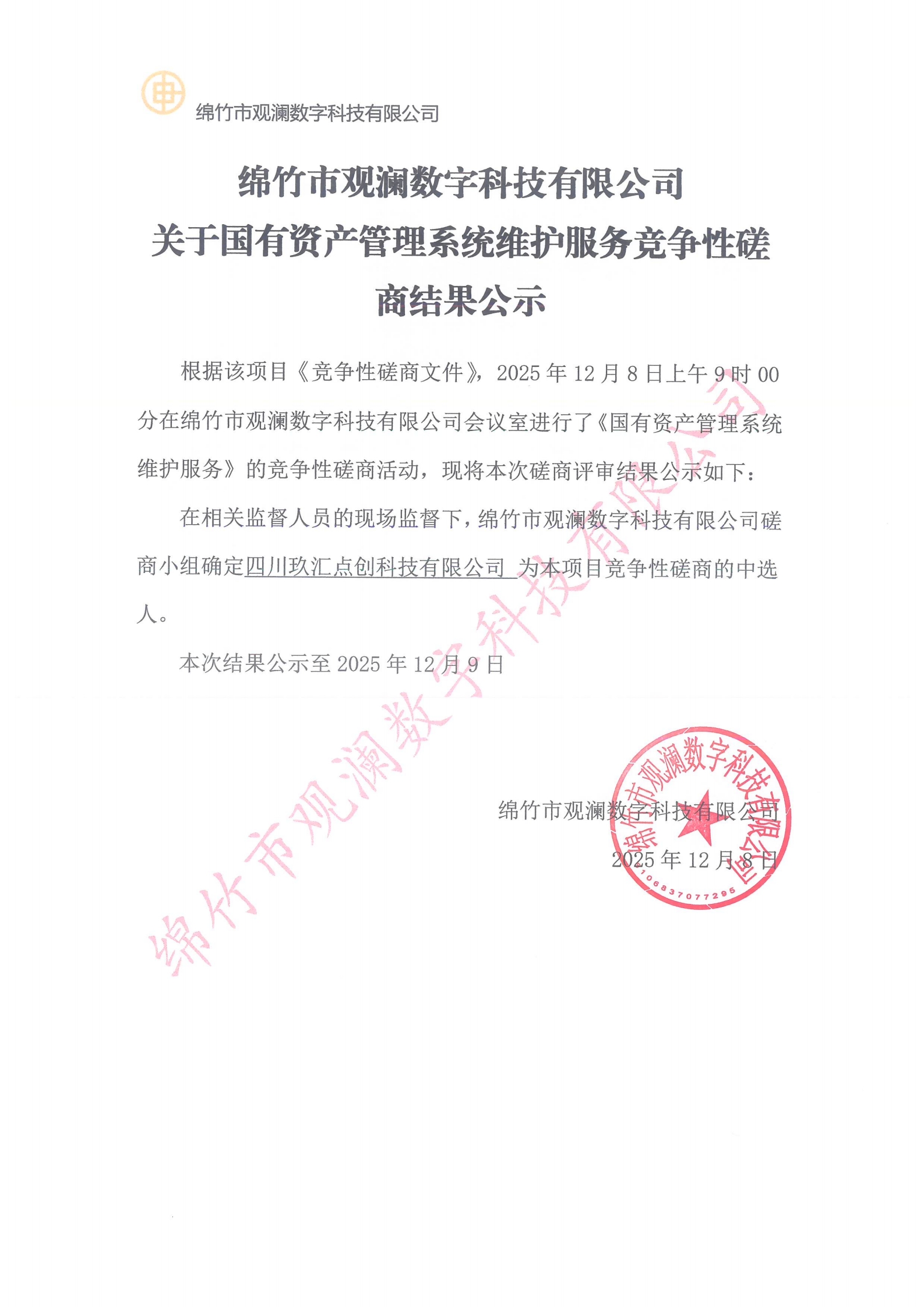 綿竹市觀瀾數(shù)字科技有限公司關(guān)于國有資產(chǎn)管理系統(tǒng)維護服務競爭性磋商結(jié)果公示