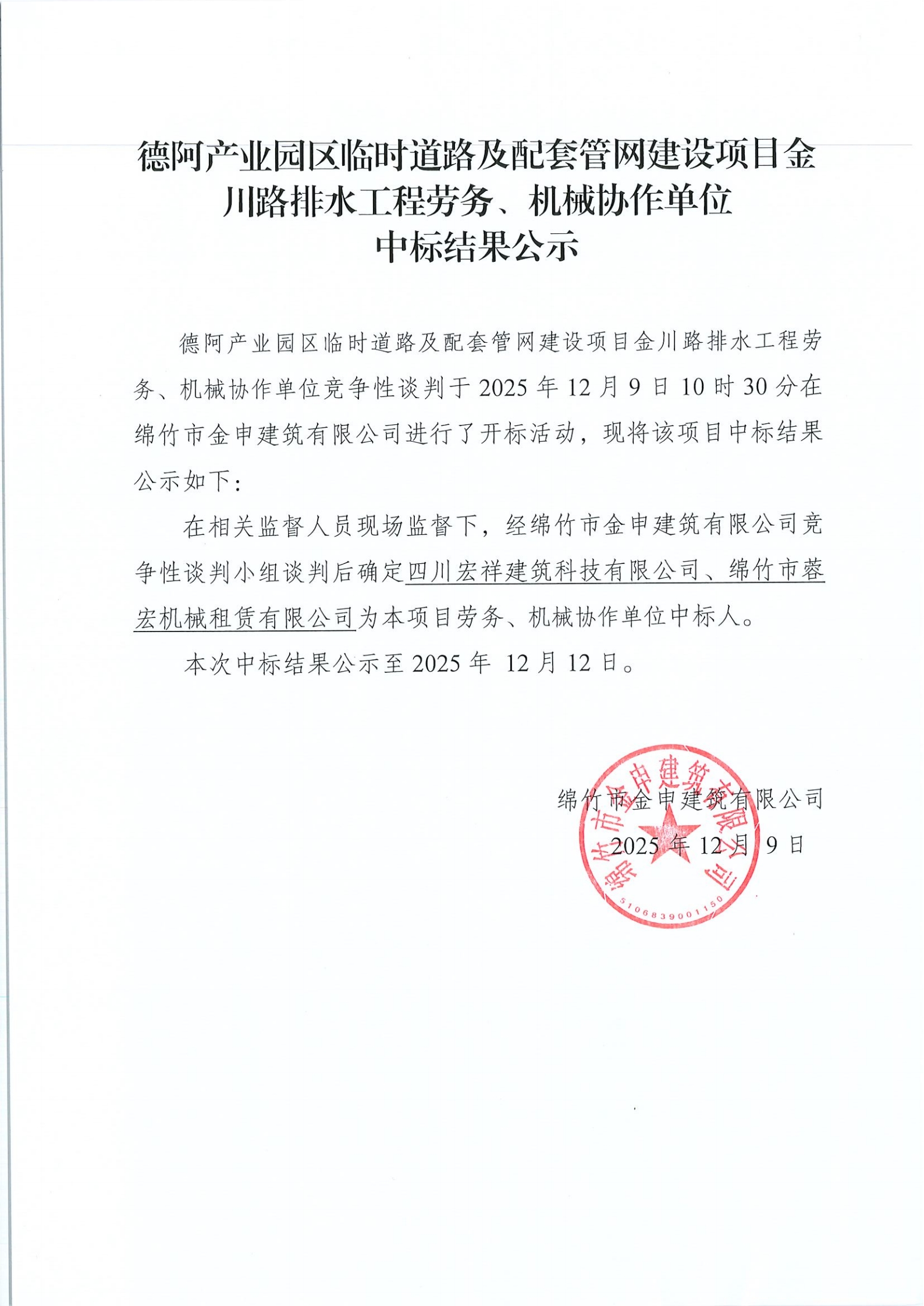 德阿產(chǎn)業(yè)園區(qū)臨時(shí)道路及配套管網(wǎng)建設(shè)項(xiàng)目金川路排水工程勞務(wù)、機(jī)械協(xié)作單位中標(biāo)結(jié)果公示