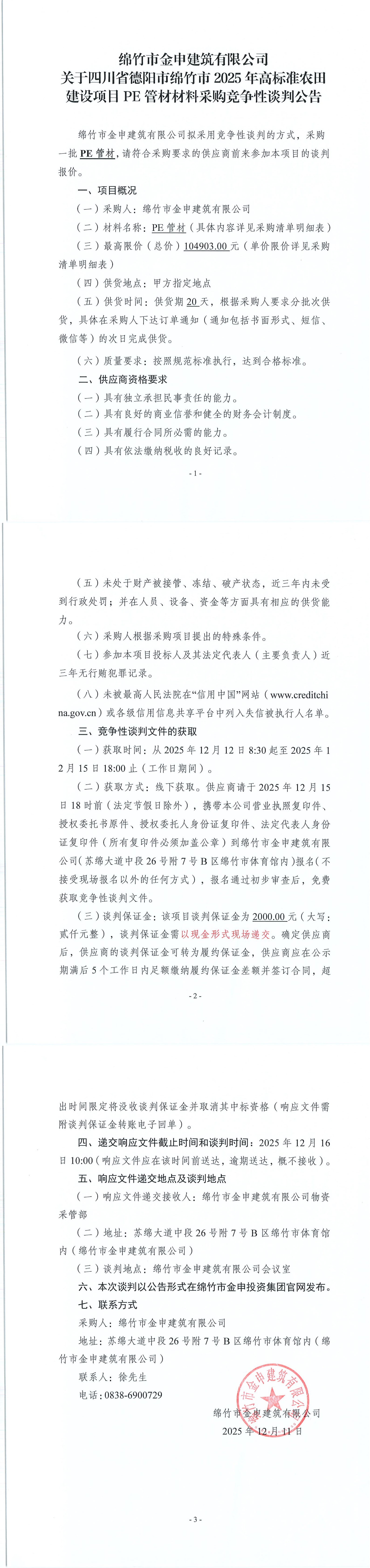 關(guān)于2025年高標(biāo)準(zhǔn)農(nóng)田PE管材材料采購(gòu)競(jìng)爭(zhēng)性談判公告