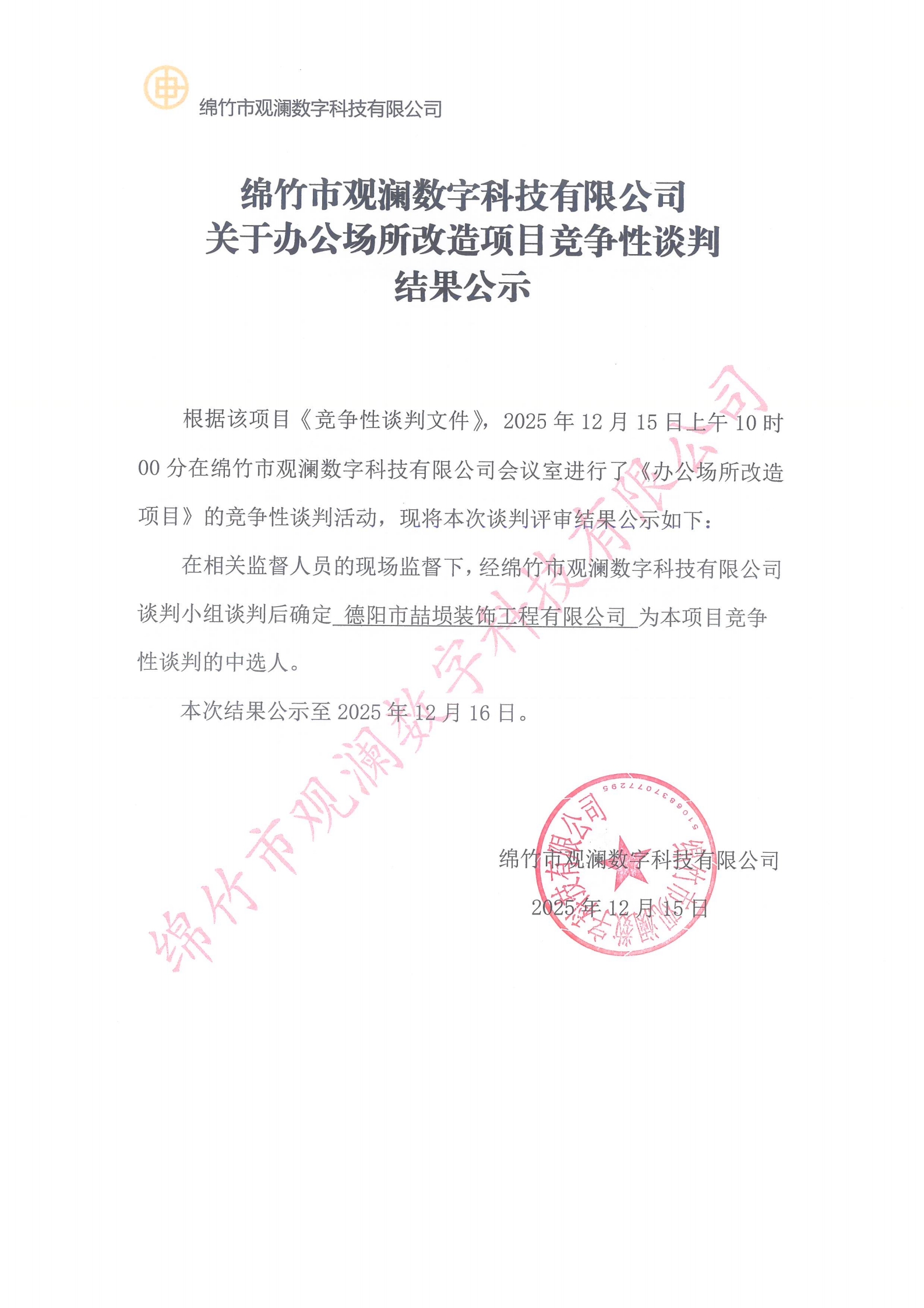 綿竹市觀瀾數(shù)字科技有限公司關(guān)于辦公場所改造項(xiàng)目競爭性談判結(jié)果公示