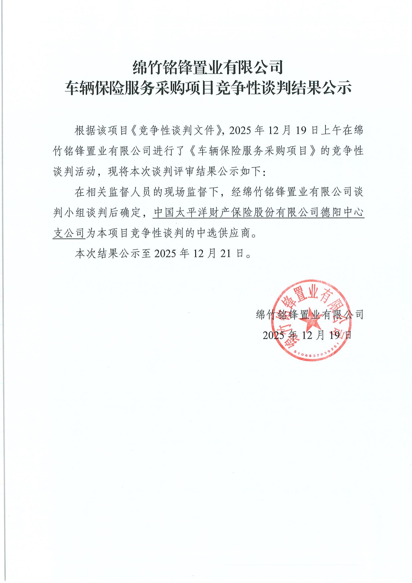 車輛保險服務(wù)采購項目競爭性談判結(jié)果公示