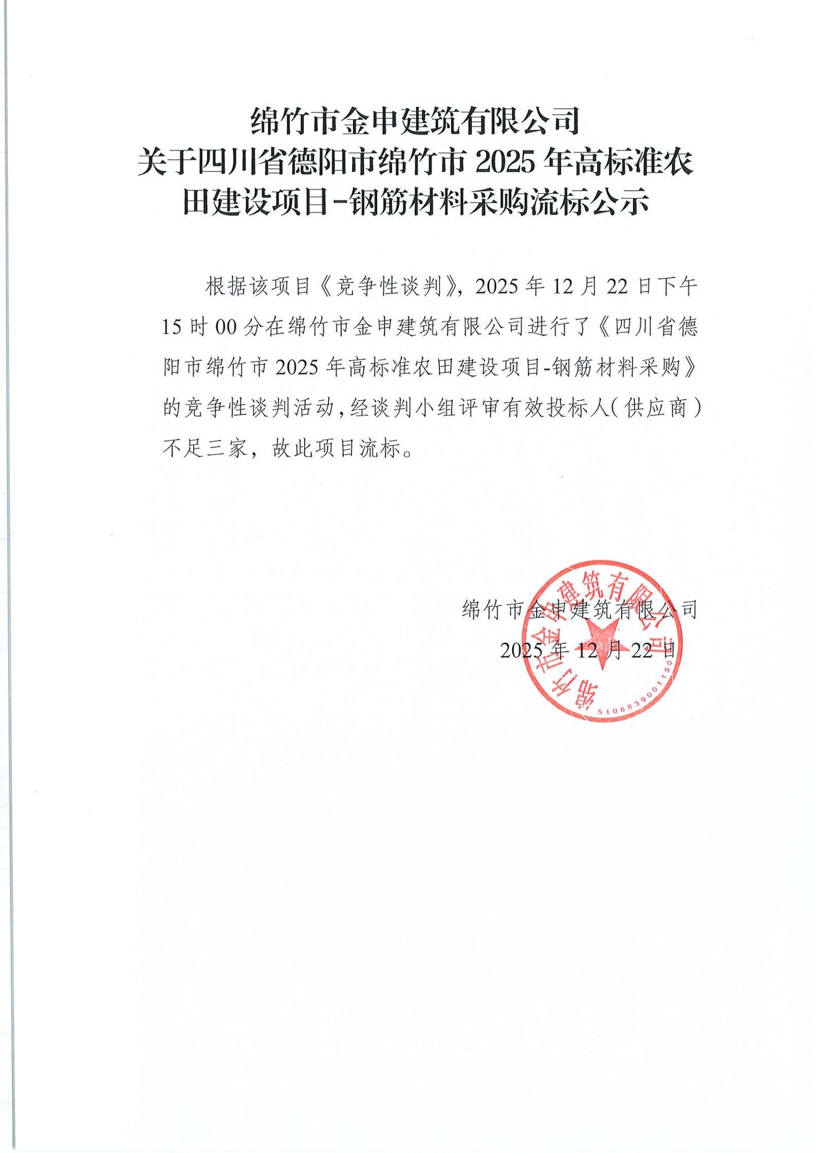 金申建筑關(guān)于四川省德陽市綿竹市2025年高標(biāo)準(zhǔn)農(nóng)田建設(shè)項(xiàng)目-鋼筋材料采購流標(biāo)公示