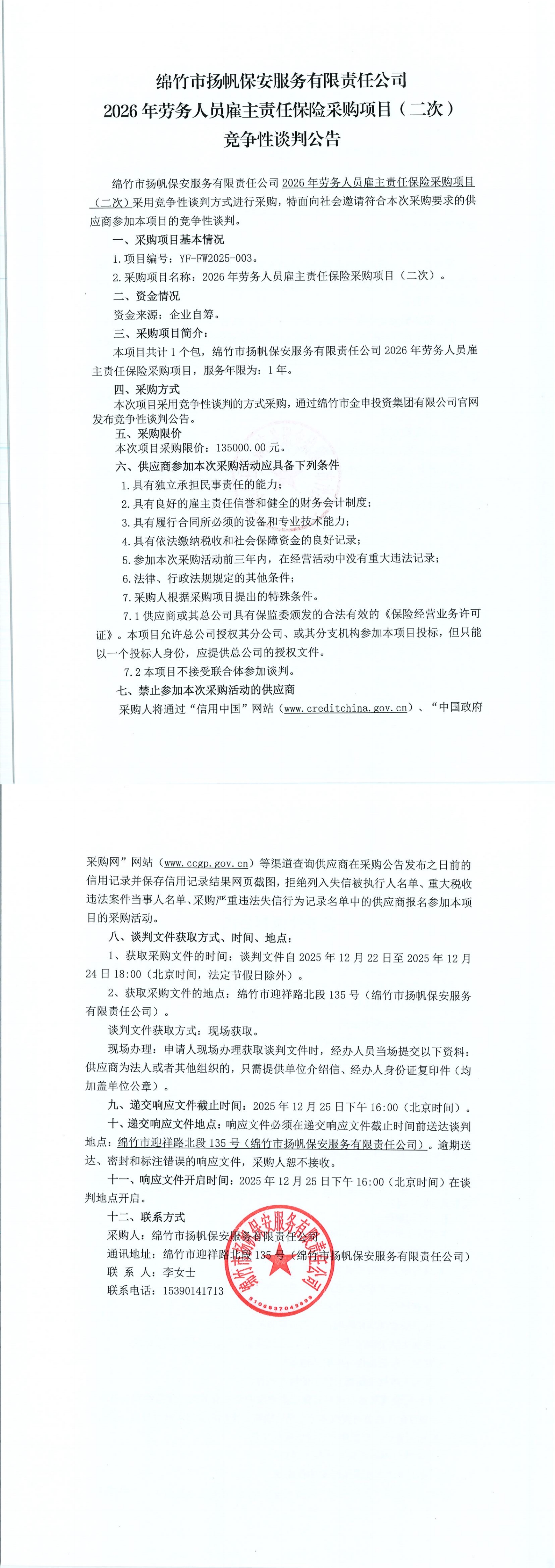 揚帆保安2026年勞務(wù)人員雇主責(zé)任保險采購項目(二次)競爭性談判公告