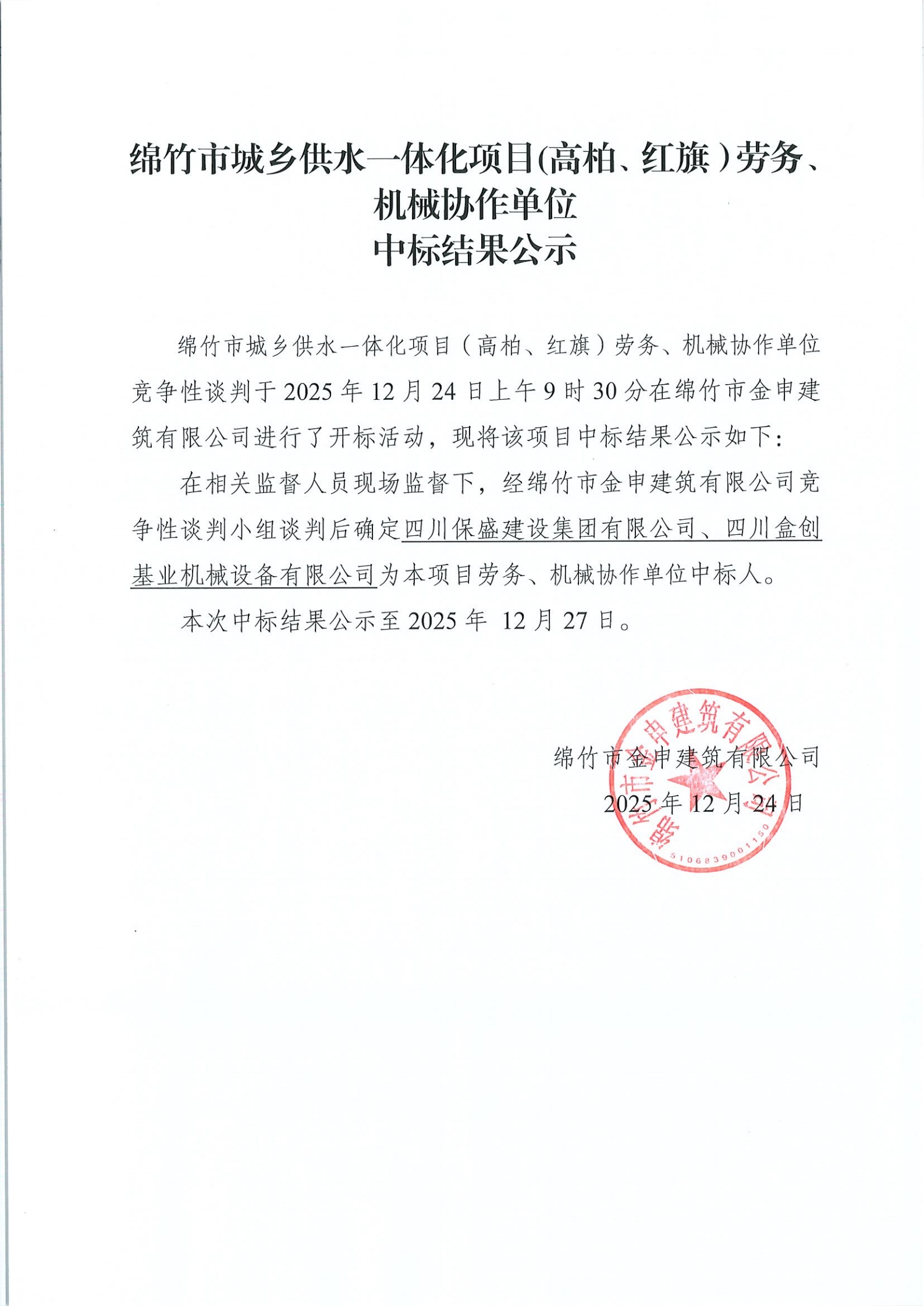 綿竹市城鄉(xiāng)供水一體化項(xiàng)目(高柏、紅旗)勞務(wù)、機(jī)械協(xié)作單位中標(biāo)結(jié)果公示