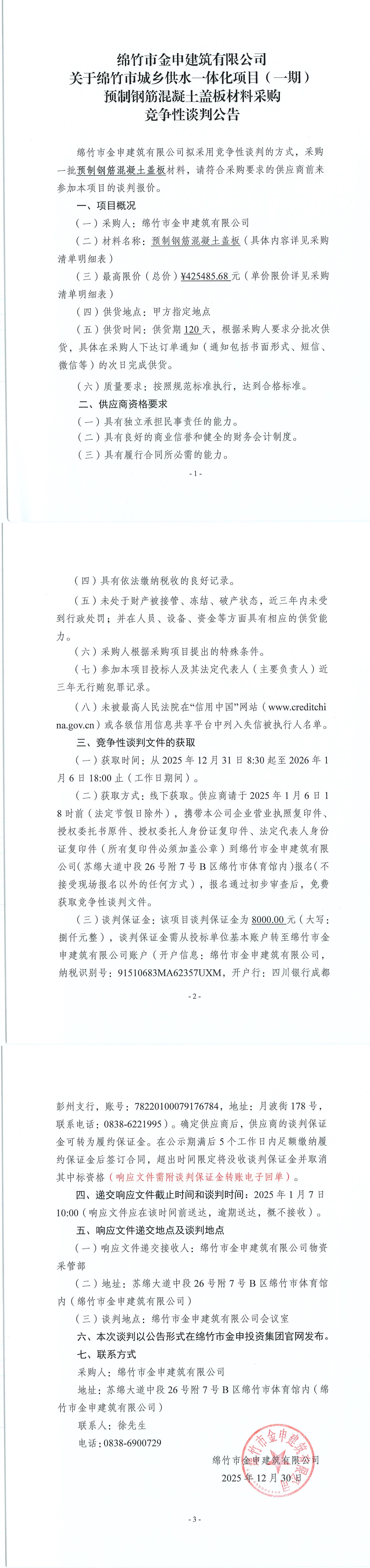 金申建筑關(guān)于城鄉(xiāng)供水一期預(yù)制鋼筋混凝土蓋板材料采購(gòu)競(jìng)爭(zhēng)性談判公告