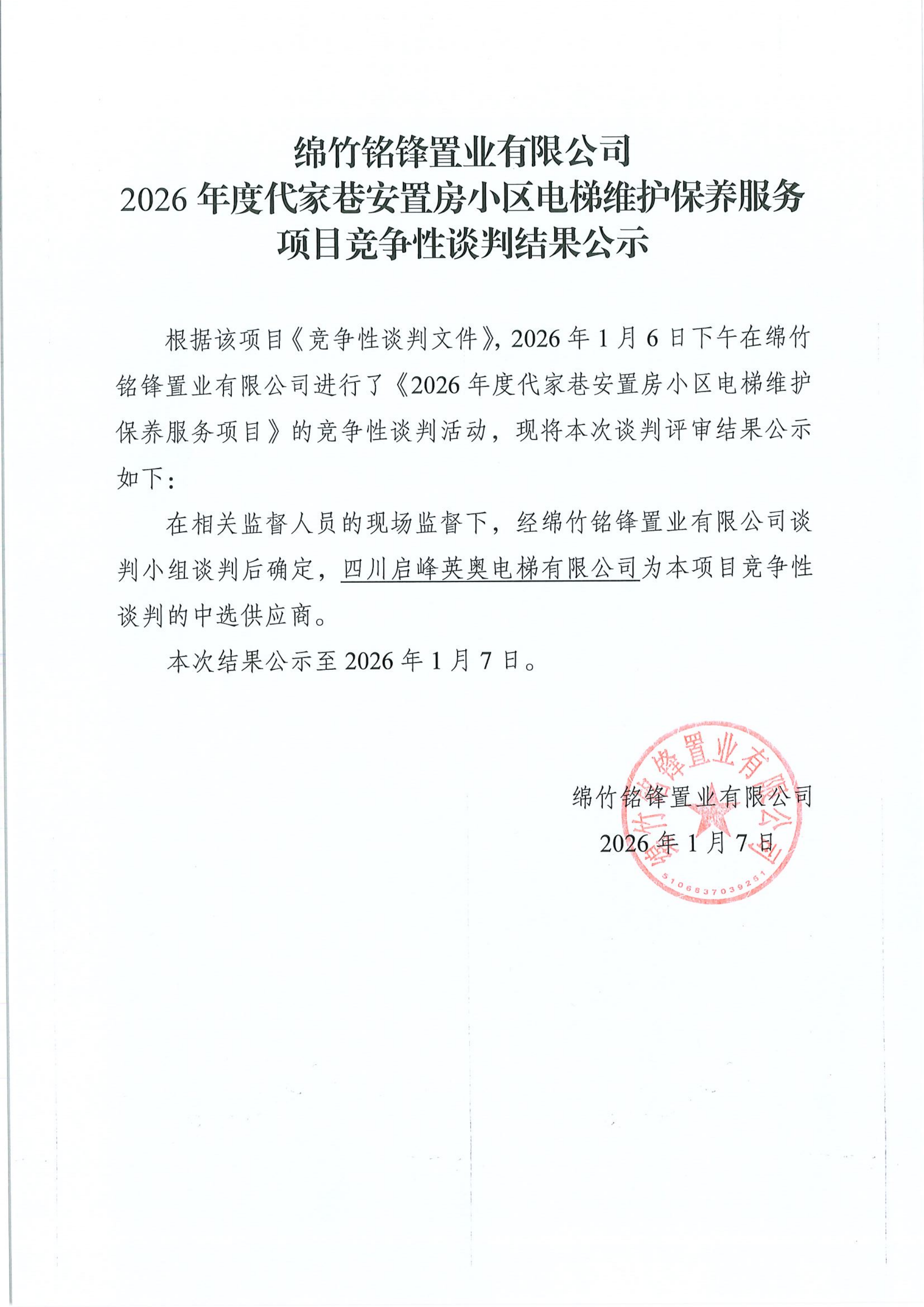 2026年度代家巷安置房小區(qū)電梯維護(hù)保養(yǎng)服務(wù)項(xiàng)目競(jìng)爭(zhēng)性談判結(jié)果公示