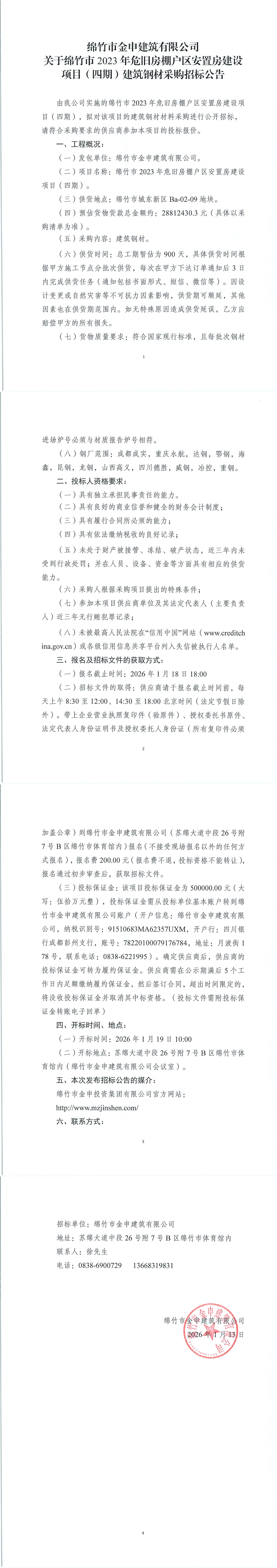 關(guān)于綿竹市2023年危舊房棚戶區(qū)安置房建設(shè)項目(四期)建筑鋼材材料采購招標公告
