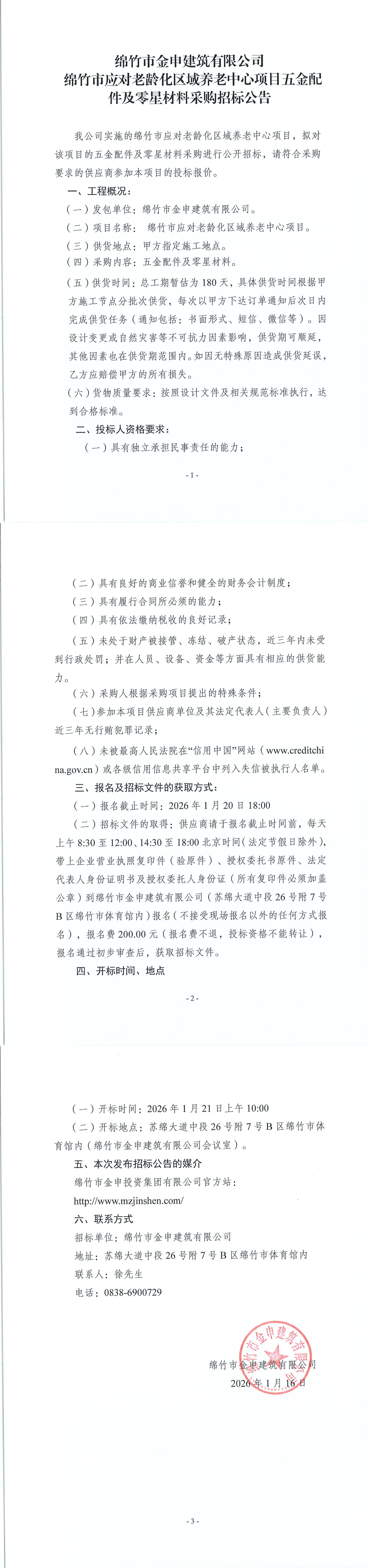 綿竹老齡化區(qū)域養(yǎng)老中心項目五金配件及零星材料采購招標公告