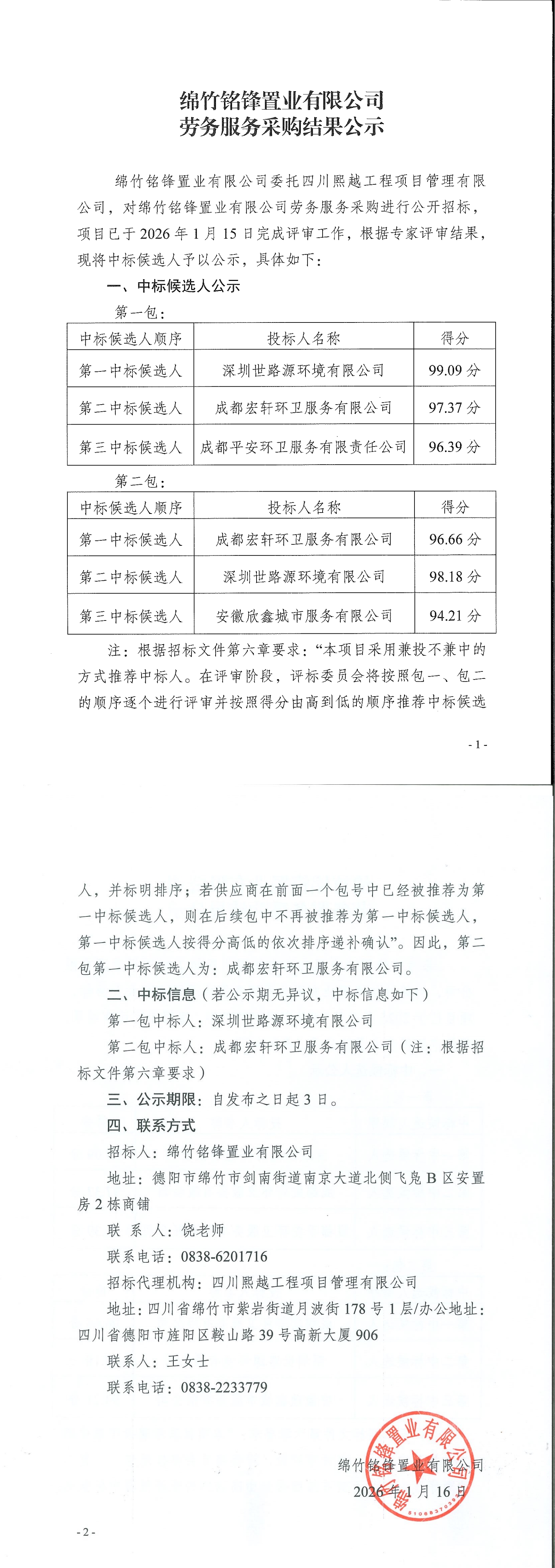 綿竹銘鋒置業(yè)有限公司勞務(wù)服務(wù)采購(gòu)結(jié)果公示
