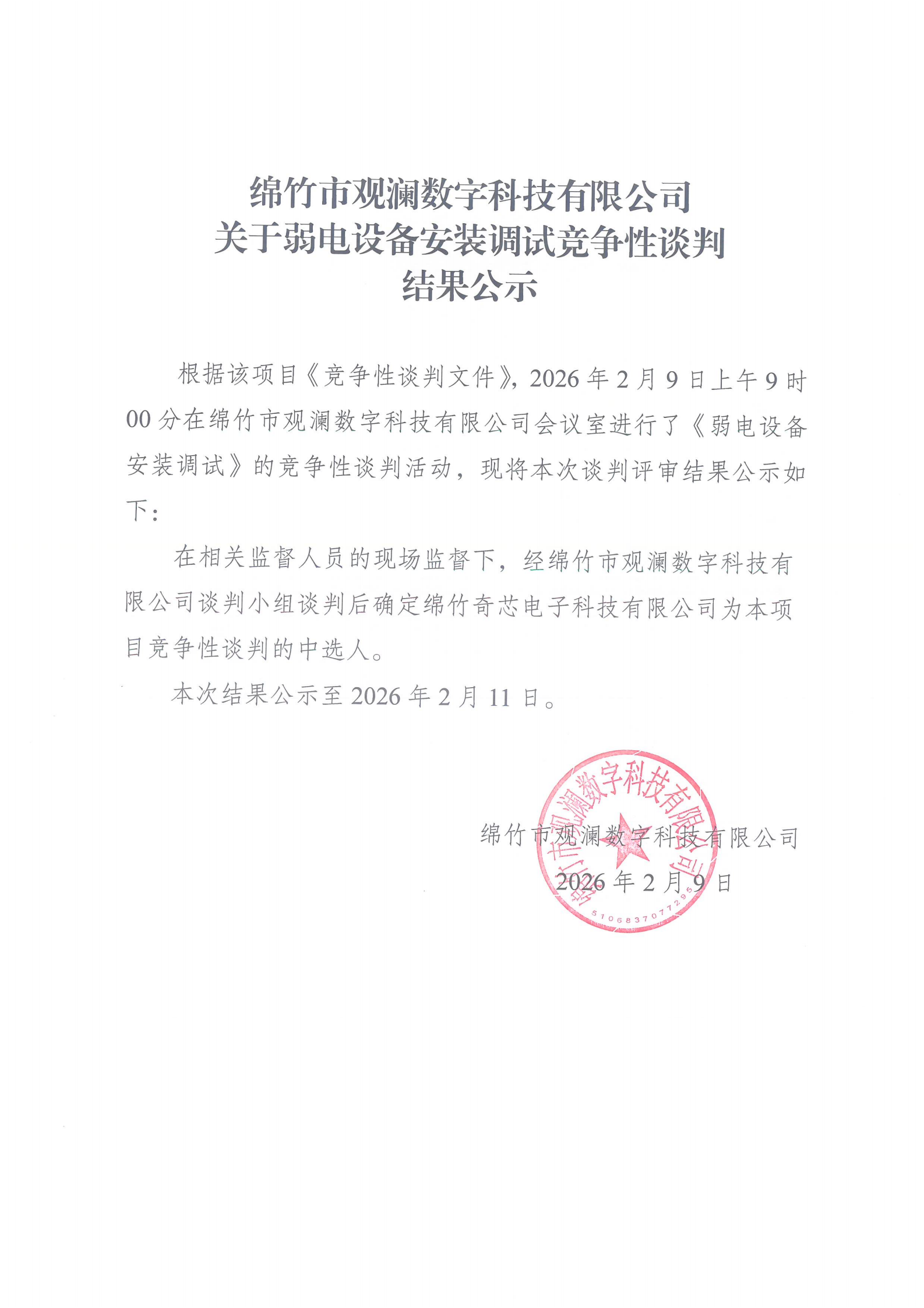 觀瀾數(shù)科關(guān)于弱電設(shè)備安裝調(diào)試競爭性談判結(jié)果公示