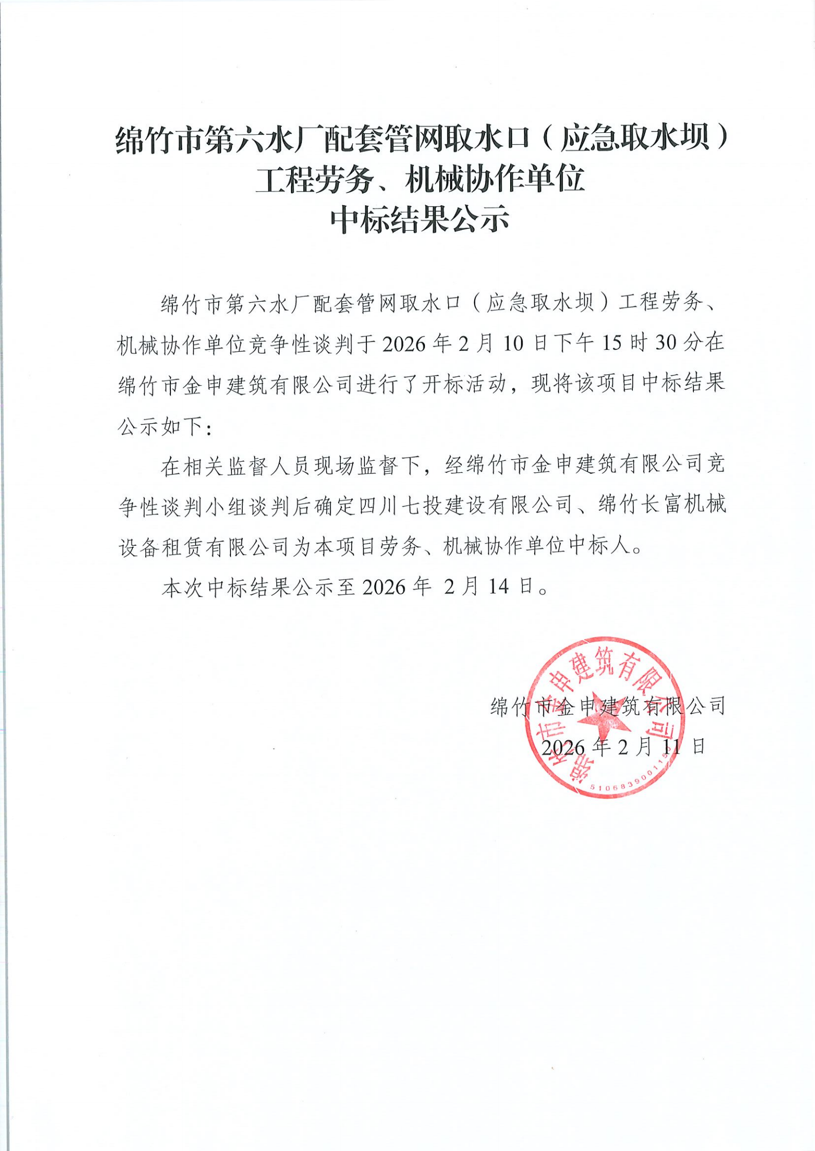 市第六水廠配套管網(wǎng)取水口(應(yīng)急取水壩)工程勞務(wù)、機械協(xié)作單位中標結(jié)果公示